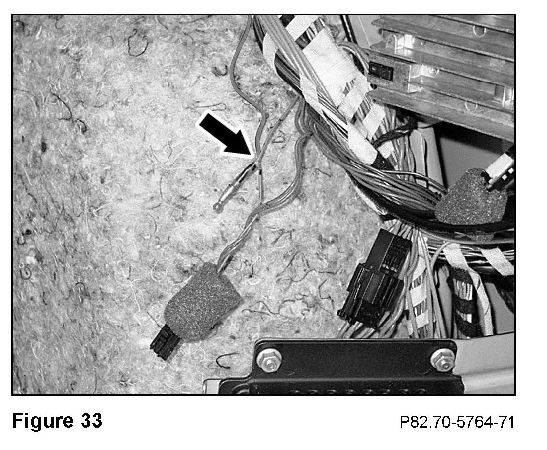 11. Remove the tape from the power supply wiring harness for the linear compensator from the connector to the point where it branches off the main wiring harness (Figure 32).