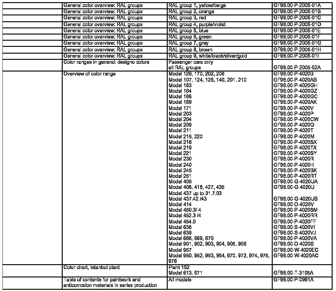 The following color charts represent passenger car and cross-country vehicle color shades painted since 1963, sorted according to RAL groups. Due to the large number of color shades in the commercial vehicle area (approx. 3000) a list is not shown here.