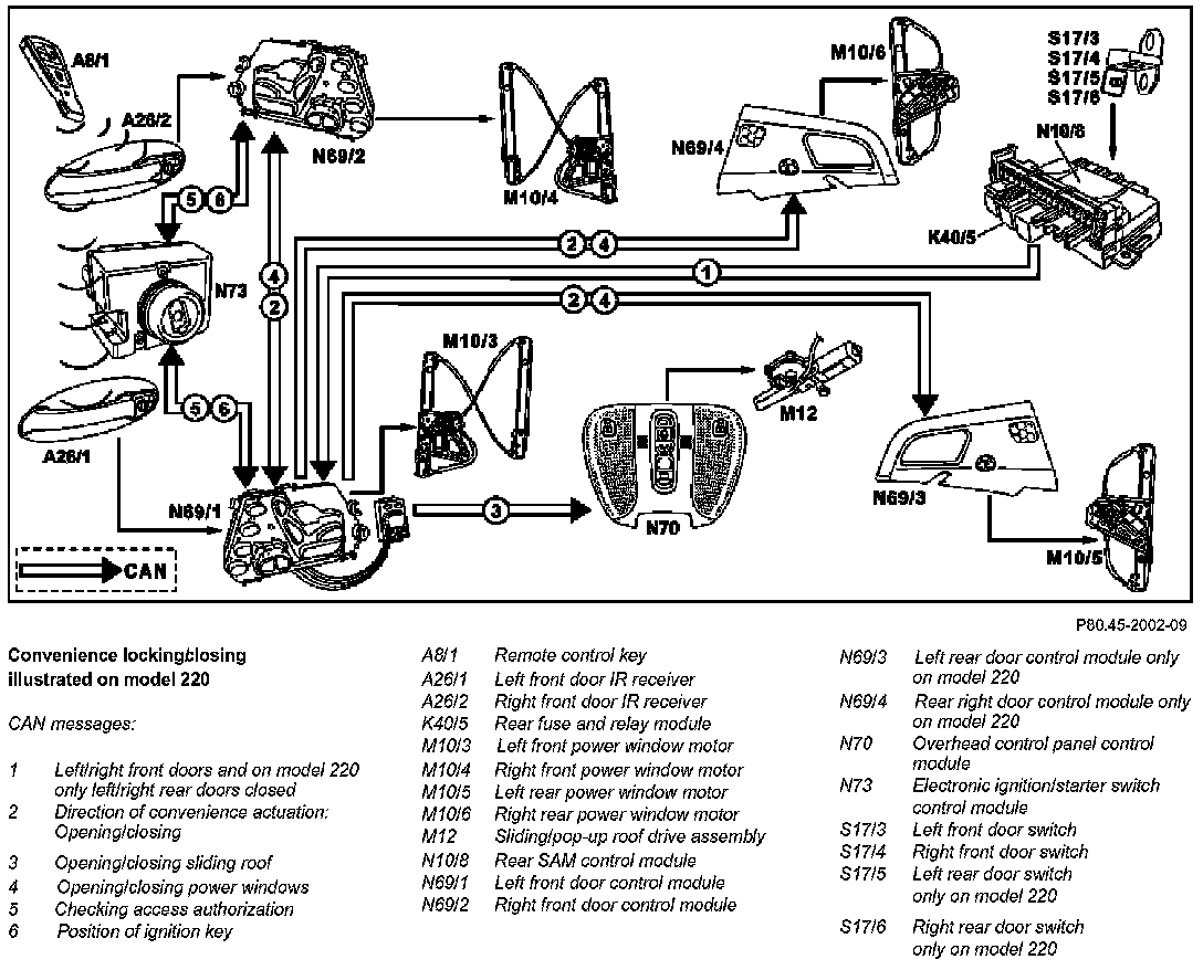 When the function prerequisites are fulfilled the left front door control module (N69/1) or right front door control module (N69/2) transfers the command for convenience closing to the CAN bus. The CAN messages are received by the overhead control panel control module (N70) as well as by the other door control modules. These control modules actuate the sliding/pop-up roof convenience closing and power window convenience closing functions. On model 215 the left and right rear power window motors are actuated by the rear control module (N22/6).