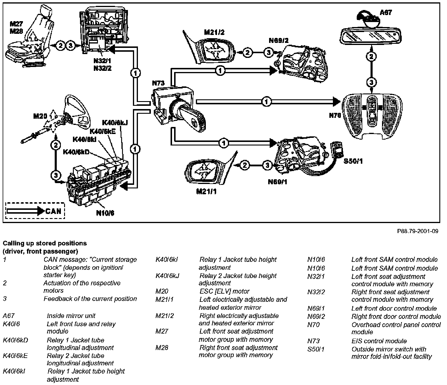 When the memory feature is called up by pressing the memory 1 switch (N69/2s6), memory 2 switch (N69/2s7) ERGONOMY switch (N69/2s9) in the right front door control module (N69/2), the positions of the front passenger's seat stored in the right front seat adjustment control module with memory (N32/2) are approached. The right front door control module (N69/2) recognizes that a switch is pressed and places the following message on the CAN: "Right front memory - Assume position 1/2/Ergo". This message is received from right front seat adjustment control module with memory (N32/2) which then, when the button is pressed further, actuates the motors of the right front seat adjustment motor group with memory (M28) until it is recognized via local position recognitions that the stored positions are reached.