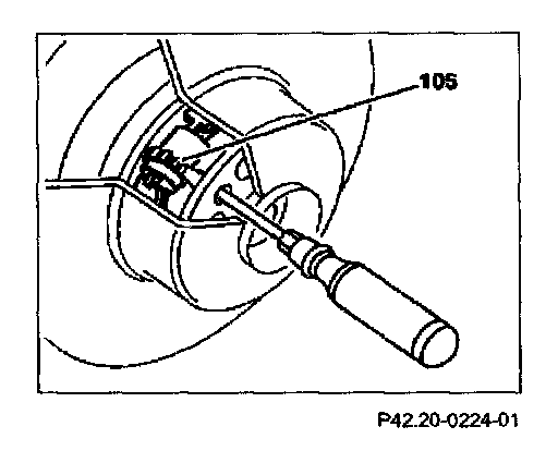 6 Using a suitable tool turn the adjusting wheel (105) until the brake shoes contact the brake drum and that it is no longer possible to rotate the rear wheel