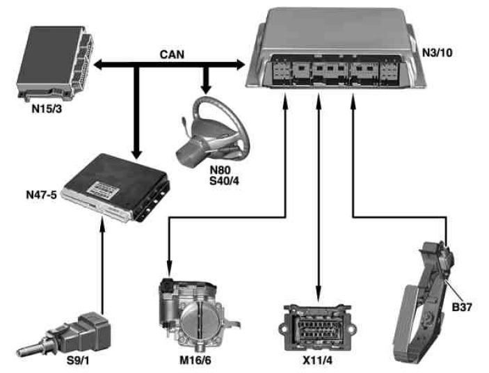 The Hall sensor in the accelerator pedal sensor sends an appropriate voltage signal to the ME control unit. The ME control unit analyzes the voltage signal and, depending on the performance map, activates the throttle valve actuator.