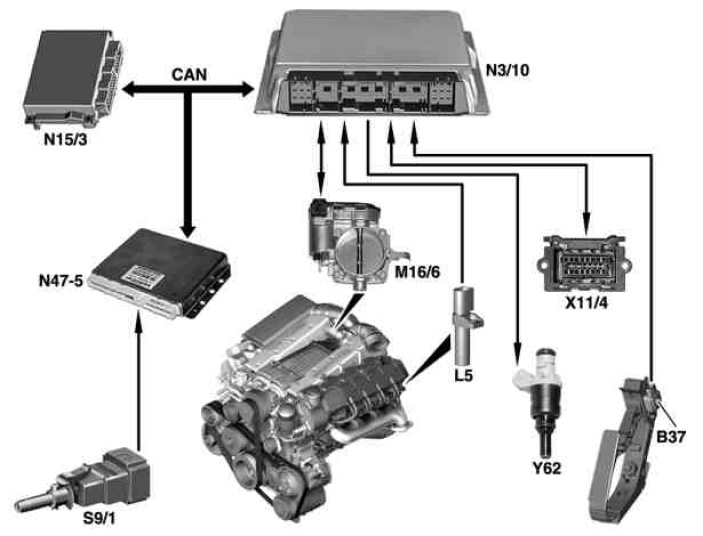 While driving, depending on the engine load, engine speed is controlled to about 1800 rpm by switching the cylinders on and off on the fuel side. In doing so, the maximum engine speed is determined by the throttle valve emergency mode position.