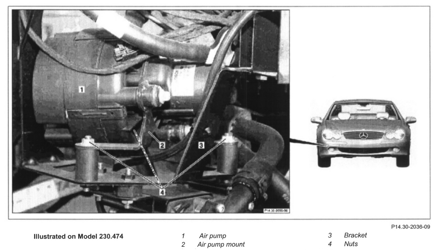 2 Unbolt air pump (1) from bracket (3) together with air pump mount (2)