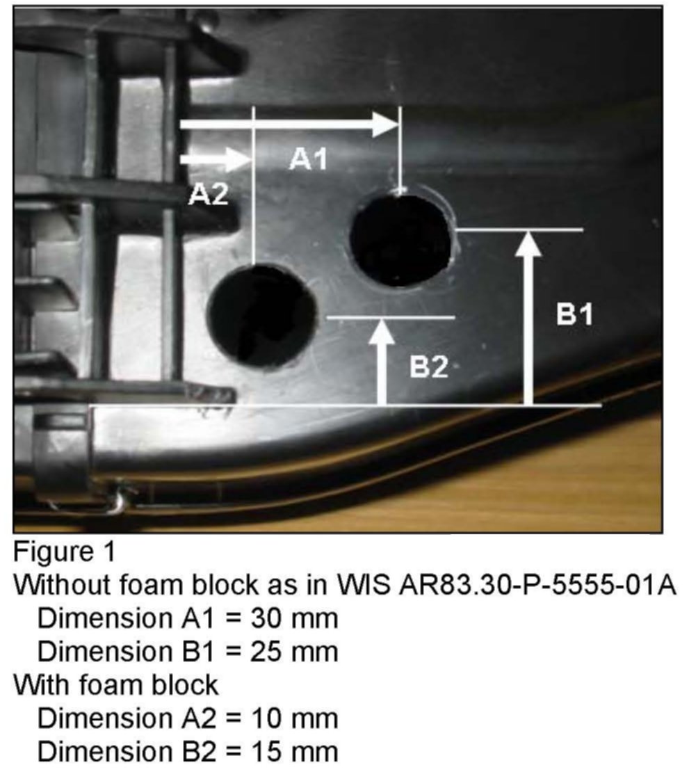 1. Equipped with ACC climate system Option Code 580 - It is necessary to drill a 15mm hole in the climate housing to access the evaporator with the spray probe. The location for drilling the hole is described in WIS document AR83.30-P-5555-01A and Figure 1, A1 and B1.