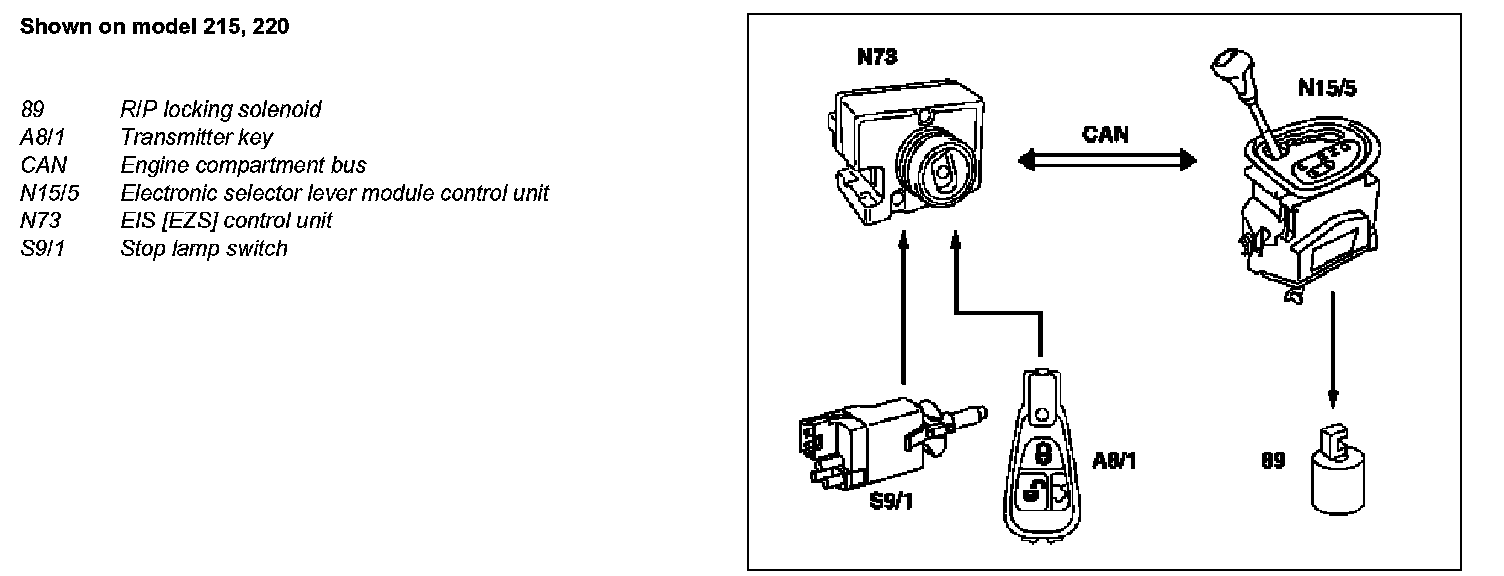 Upon receipt of a valid drive authorization code from the EIS [EZS] control unit (N73) via the engine compartment bus (CAN) the electronic selector lever module control unit (N15/5) actuates the R/P locking solenoids (89) when the brake pedal and thus the stop lamp switch are operated (S9/1). The signal from the triggered brake lamp switch (S9/1) is also transmitted to the electronic selector lever module control unit (N15/5) via the engine compartment bus (CAN).