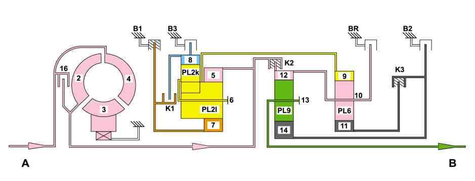 The transmission input torque and transmission input speed are transmitted to the internal-geared wheel (12) by the closed multi- disk clutch K2 (K2). An increased rpm and a reduced torque occurs due to the rpm difference between the sun gear (14) and the ring gear (12). These are passed on via the planet carrier (13) to the transmission output shaft.