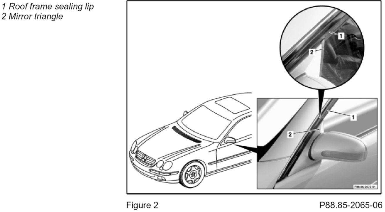 - The external roof frame sealing lip (1-Figure 2) should not contact the mirror triangle cover (2-Figure 2) when closing the door.