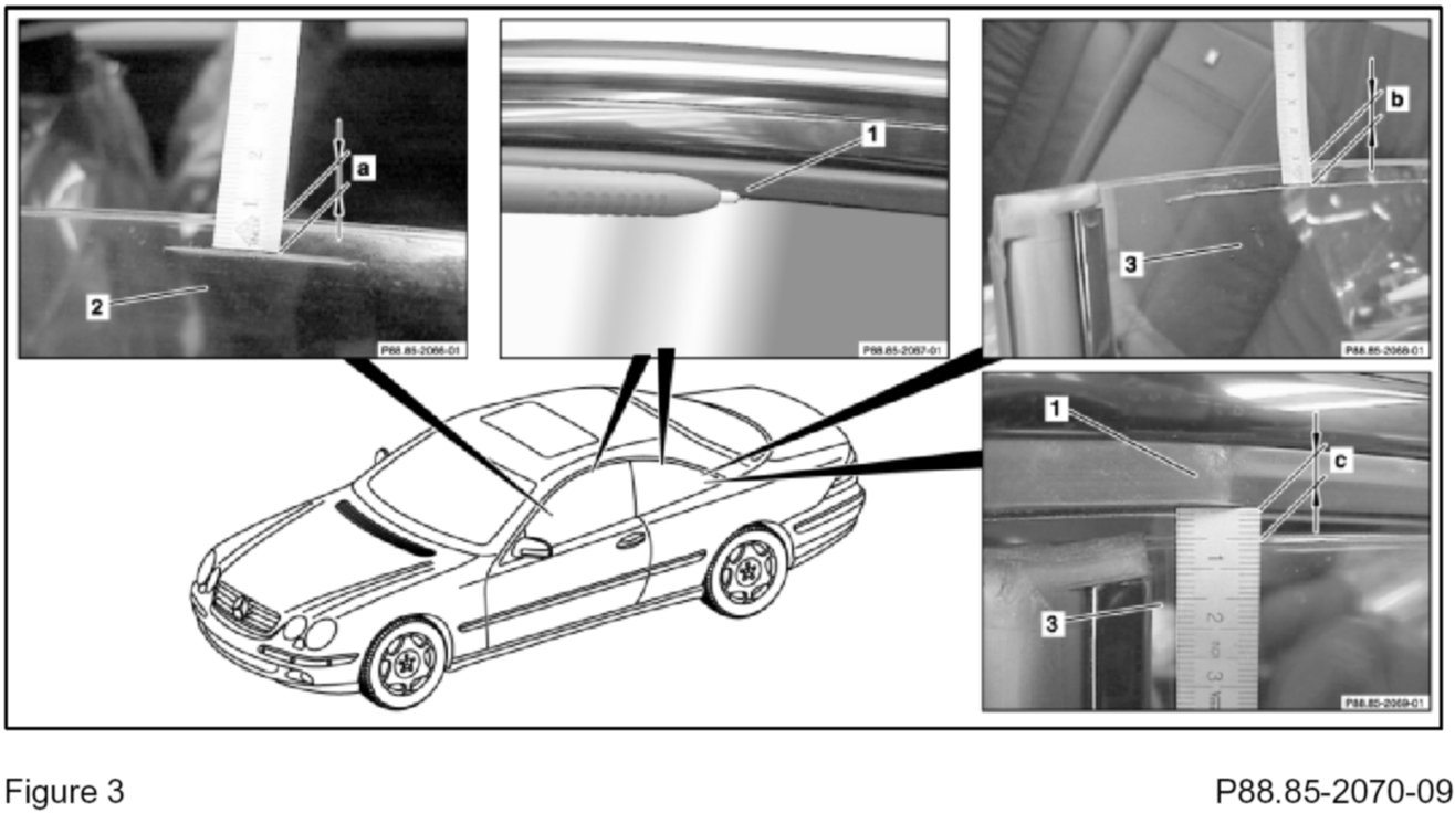 - Dimension (c-Figure 3) between the lower edge of the roof frame sealing lip (1-Figure 3) and the upper edge of the rear side window (inner window) must not exceed 4 mm.