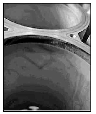 Individual blank points, e.g. in middle of cylinder or in area of cylinder head bolts. An all-round impression at the piston ring reversing point above and below.