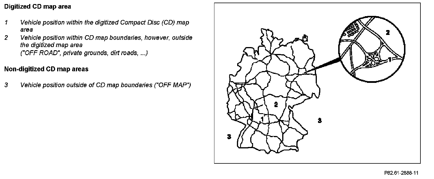 The navigation processor of the COMAND operating, display and control unit (A40/3) continuously compares the route calculation data with the constant position finding data.
