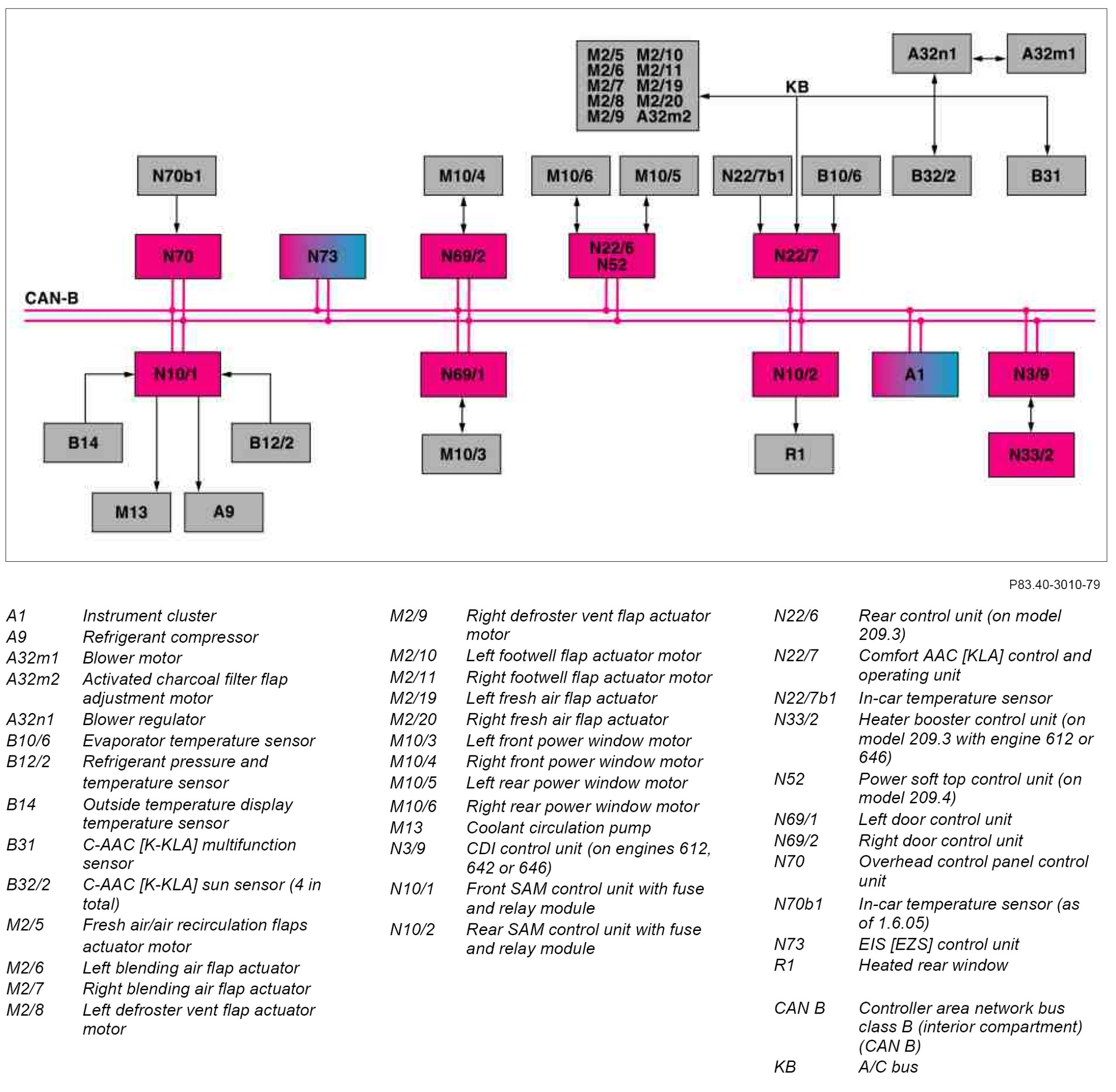 The fresh air/air recirculation flaps actuator motor (M2/5), the left blending air flap actuator motor (M2/6), the right blending air flap actuator motor (M2/7), the left defroster vent flap actuator motor (M2/8), the right defroster vent flap actuator motor (M2/9), the left footwell flap actuator motor (M2/10), the right footwell flap actuator motor (M2/11), the left fresh air flap actuator motor (M2/19), the right fresh air flap actuator motor (M2/20), the activated charcoal filter flap adjustment motor (A32m2) for the air distribution and the blower motor (A32m1) for the air volume are controlled by the comfort AAC [KLA] control and operating unit (N22/7) via the A/C bus (KB) .