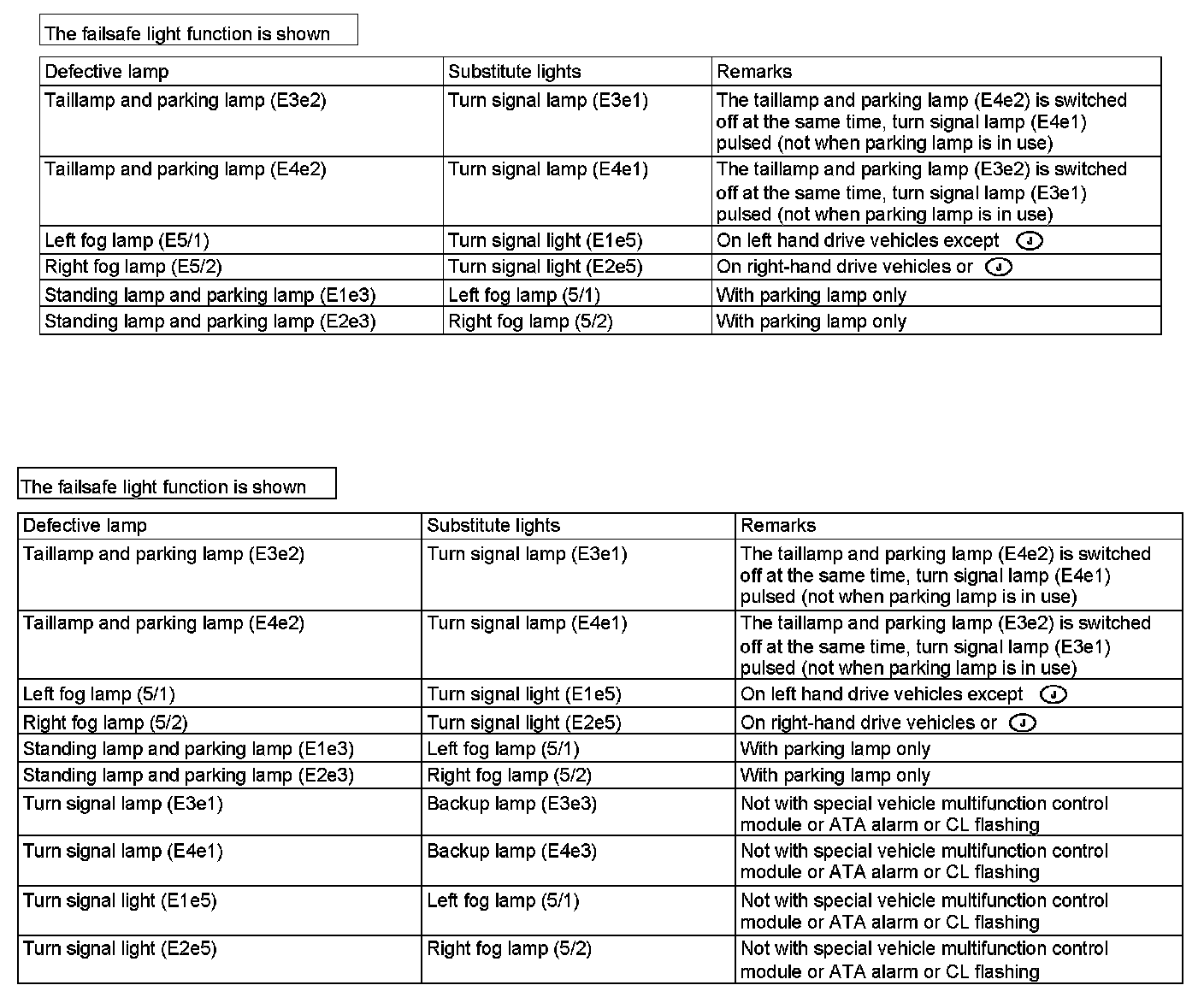If the low beam (E1e2) in the left front headlamp unit (E1) fails and the low beam (E2e2) in the right front headlamp unit (E2) fails the parking lamp/standing lamp (E1e3) and the parking lamp/standing lamp (E2e3) serves as emergency lighting.