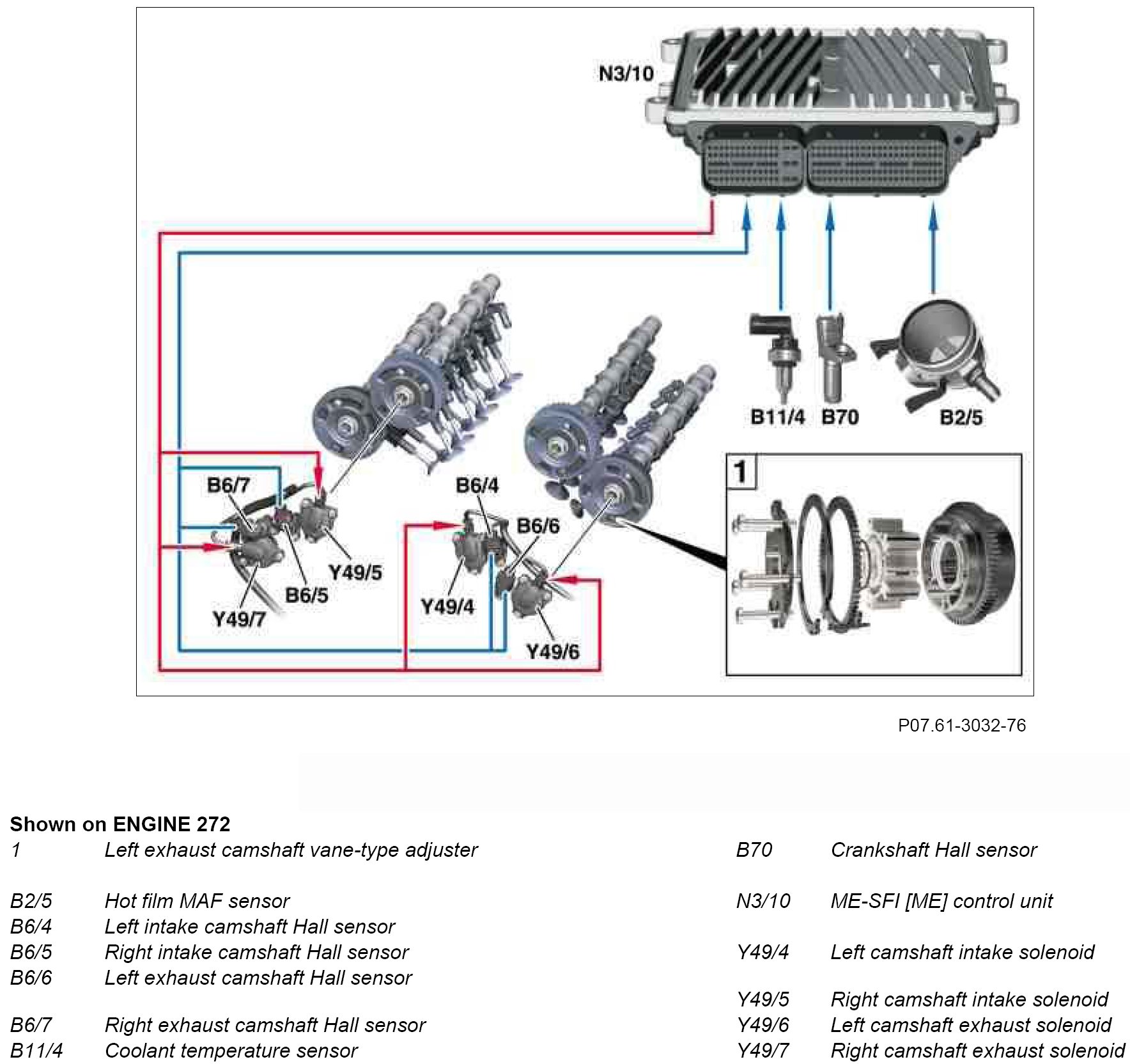 The solenoids upstream of the camshafts are actuated by the ME control unit on the ground side. The control plungers of the vane type actuators are operated via the map-dependent duty cycle. Depending on their position, the oil volume in the vane-type adjusters is controlled.