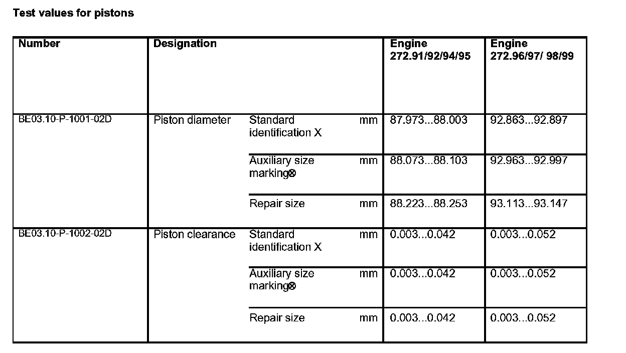 Piston diameters are specified in two tolerances. The piston diameters are differentiated from each other by the identification x or (x). This is located on the top of the piston crown. Pistons marked with x must only be installed in cylinder bores marked with x.