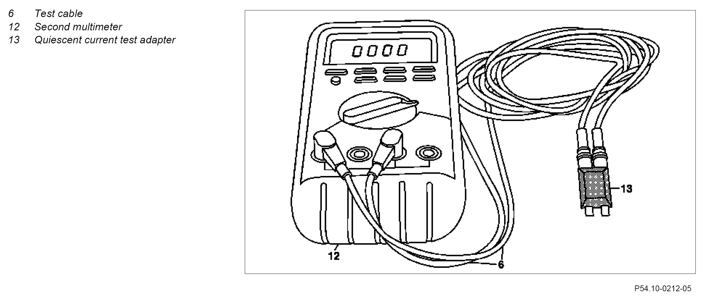 6. Connect test cable (6) and quiescent current test adapter (13) to a second multimeter (12) using electrical connection set (measuring range in amperes).