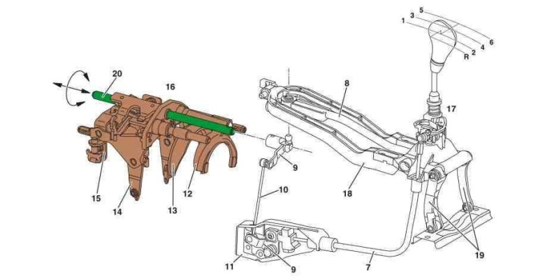 The shift cable transfers the transverse motion of the gearshift lever to the main shifter shaft (20), which is then rotated about its own axis.