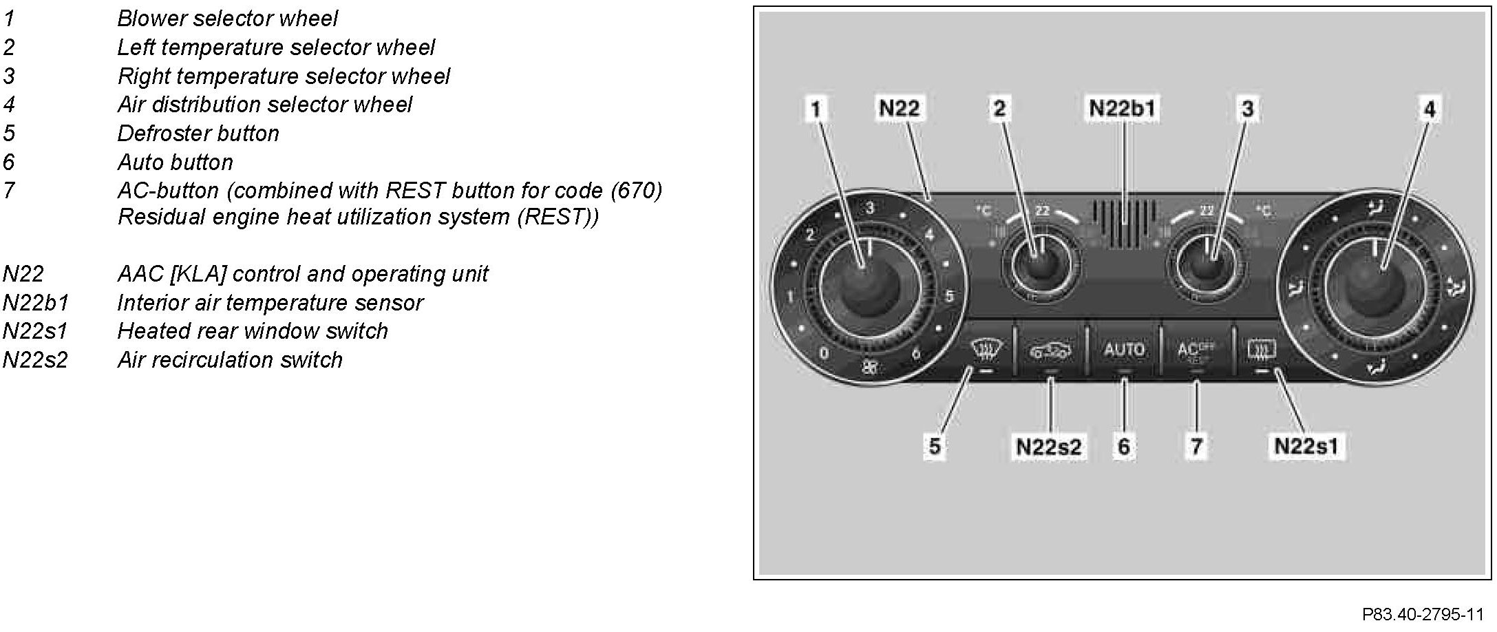 The AAC [KLA] control and operating unit (N22) controls and regulates all climate control functions for the vehicle interior: