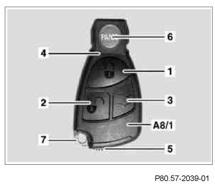 The mechanical key (7) can be removed from the transmitter key (A8/1) by pressing the release button (5). When the vehicle is locked or unlocked with the mechanical key (7) the central locking is not actuated. The anti-theft alarm system (ATA) (with code (551a) anti-theft alarm system (ATA) is not deactivated.