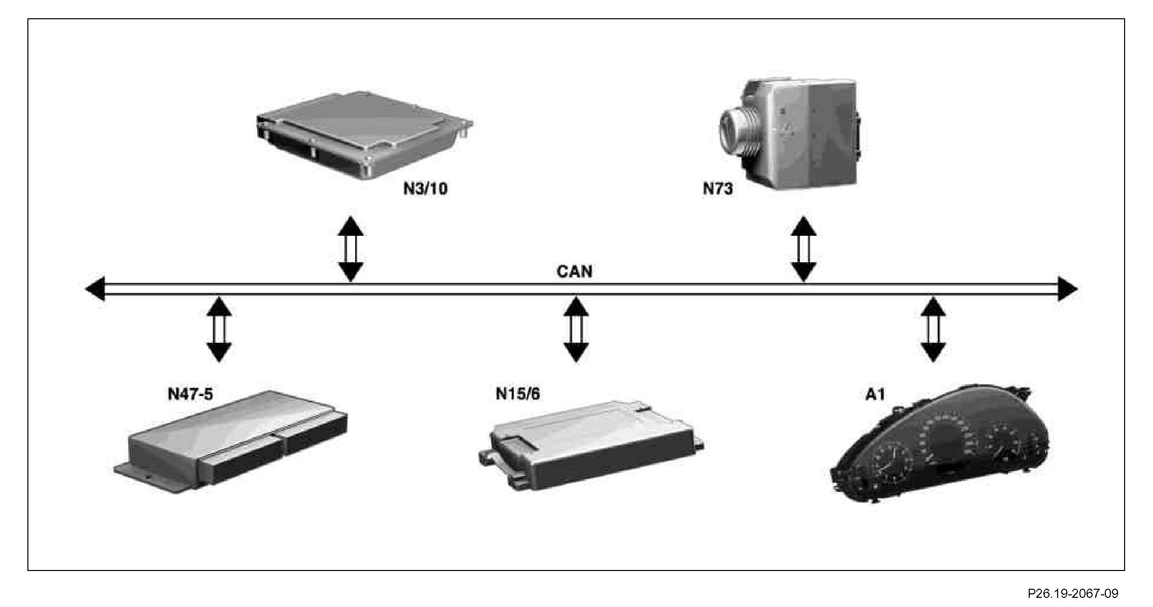 To restrict processing loads for signal generation and transmission to a reasonable level, the transmission control system makes use of digital signals that are already available in the vehicle, and calculates some of the required variables from known signals. Examples for this are the calculation of the longitudinal and lateral acceleration or the determination of the transmission/output speed from the ESP and BAS control module (N47-5) and wheel speeds provided via the CAN bus. Special service programs process incoming signals to adapt form and quality for subsequent processing in the program environments encountered within the various control units.