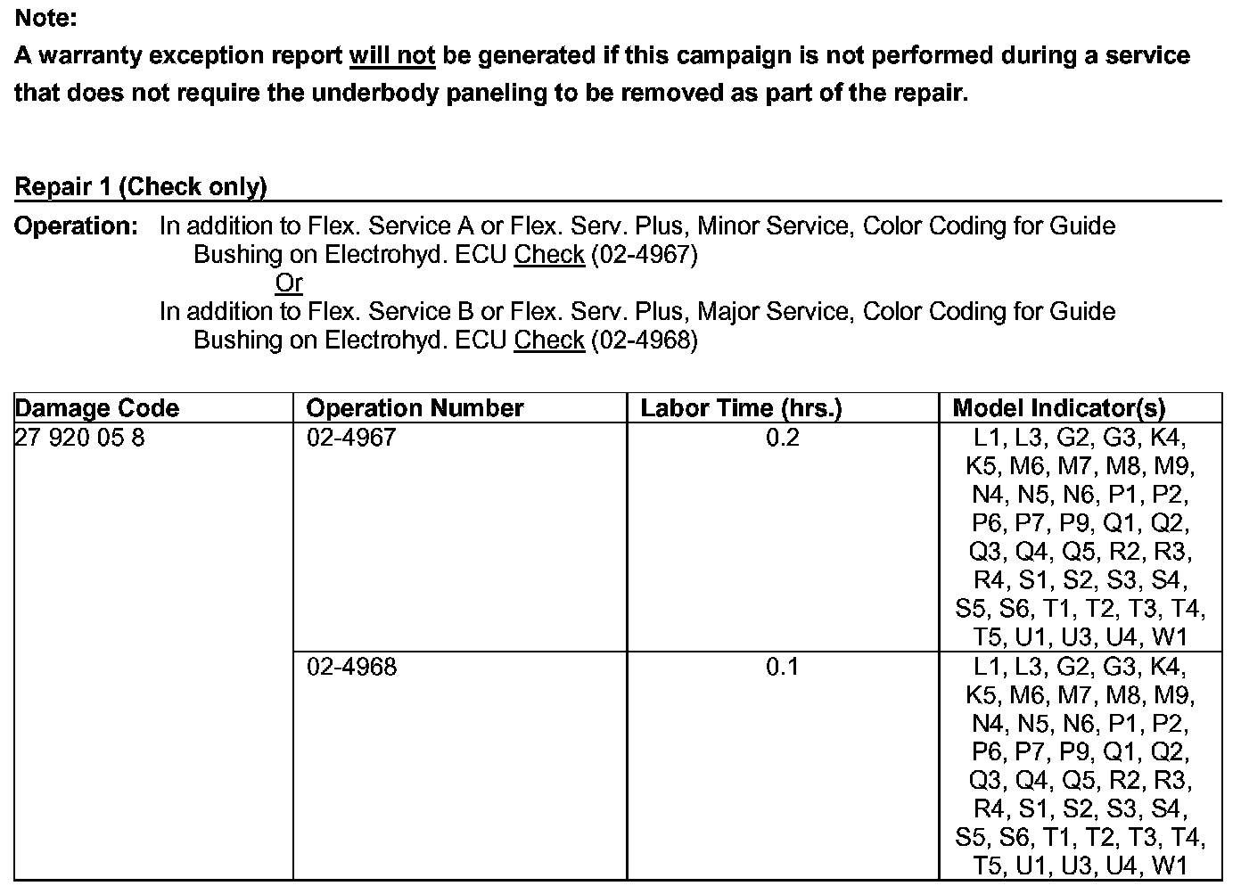 Please note this campaign must only be performed in conjunction with an A or B Service maintenance or other necessary warranty repair that requires the underbody paneling to be removed as part of the repair. Removal and re-installation of the underbody paneling is not included in the service campaign work procedure and may not be claimed separately under this service campaign.