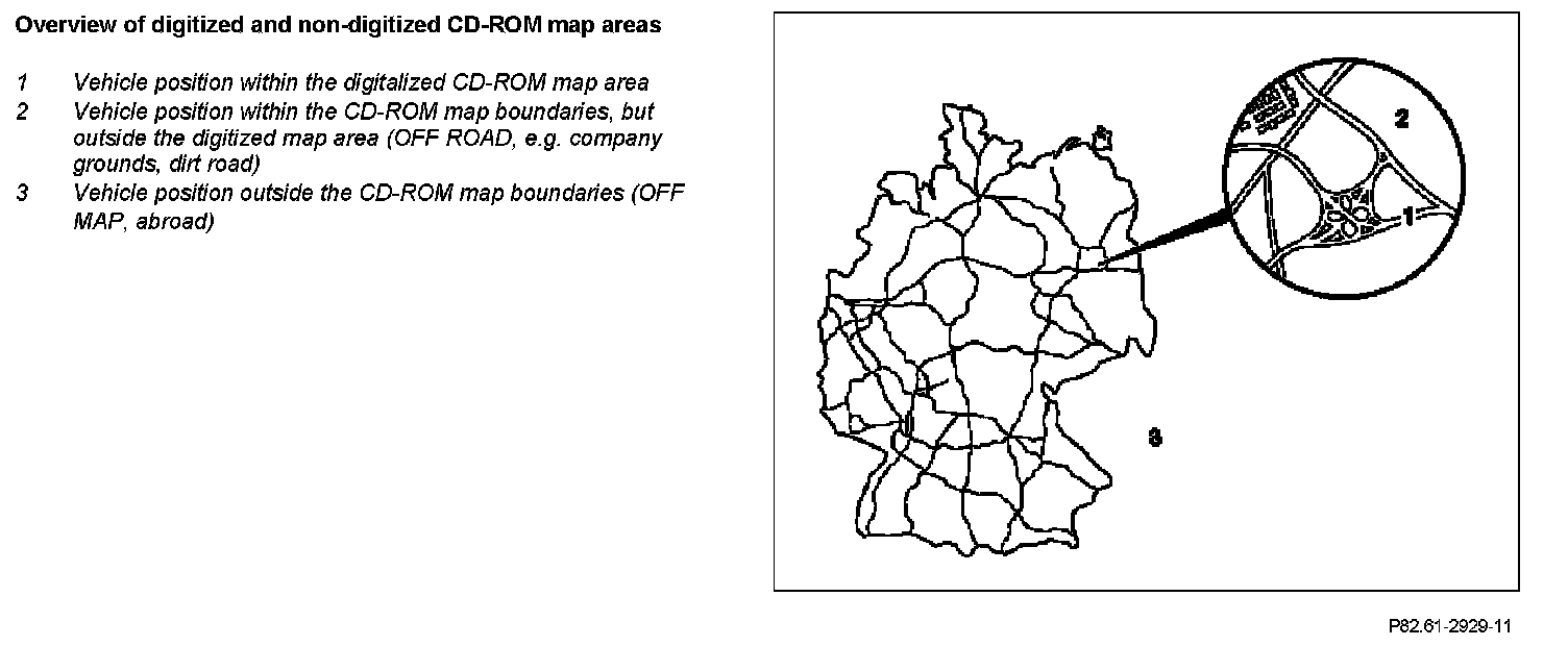 When traveling outside the digitized map area (e.g. company grounds, multi-level car parks, dirt roads) but still within the CD-ROM map boundaries, the navigation processor switches over to "Destination-oriented navigation in non-digitized map area". The message "OFF ROAD" appears on the display of the radio control panel and navigation unit. The message "OFF MAP" is displayed if the vehicle is outside of the CD-ROM map boundaries (outside the country).