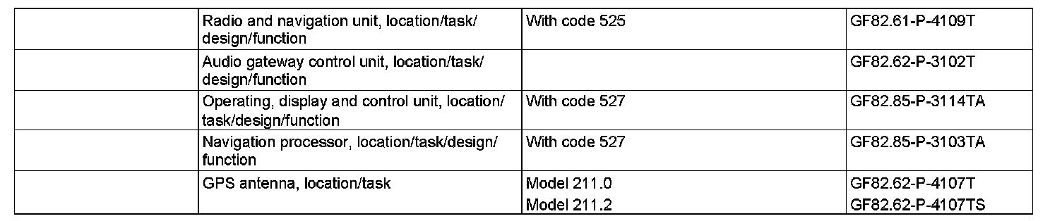 The navigation processor for the radio control panel and navigation unit (A2/56), with code (525) MB Audio 50 APS radio, is integrated into the operating unit. With the COMAND operating, display and control unit (A40/3), with code (527) COMAND APS (with navigation), the external navigation module is referred to as a navigation processor (N41/1).