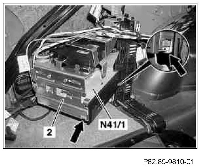 3 Push navigation processor (N41/1) into control unit bracket (2) until the catches can be heard to engage (see arrow and detail).