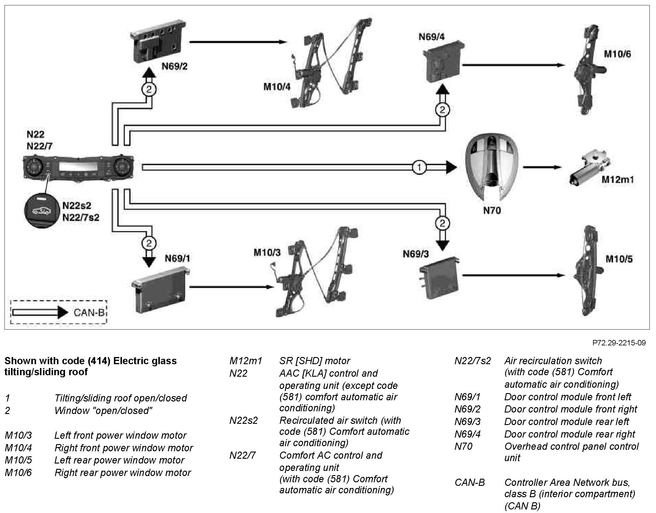 After actuating the air recirculation switch (N22s2) (except code (581) Comfort automatic air conditioning) or air recirculation switch (N22/7s2) (with code (581) Comfort automatic air conditioning) the AAC [KLA] control and operating unit (N22) (except code (581) Comfort automatic air conditioning) or comfort AAC control and operating unit (N22/7) (with code (581) Comfort automatic air conditioning) transmits the "Comfort closing" command via the interior CAN.
