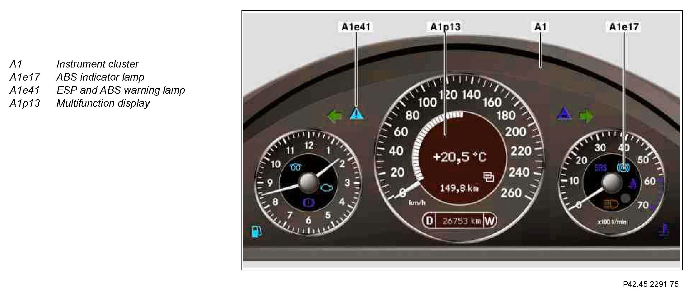 As a result the driving style can be better adapted to the road conditions. As of the end of closed-loop operation the ESP and ABS warning lamp (A1e41) continues flashing for approx. 1 second During a very brief Electronic Stability Program - closed-loop operation the ESP and ABS warning lamp (A1e41) does not light up.