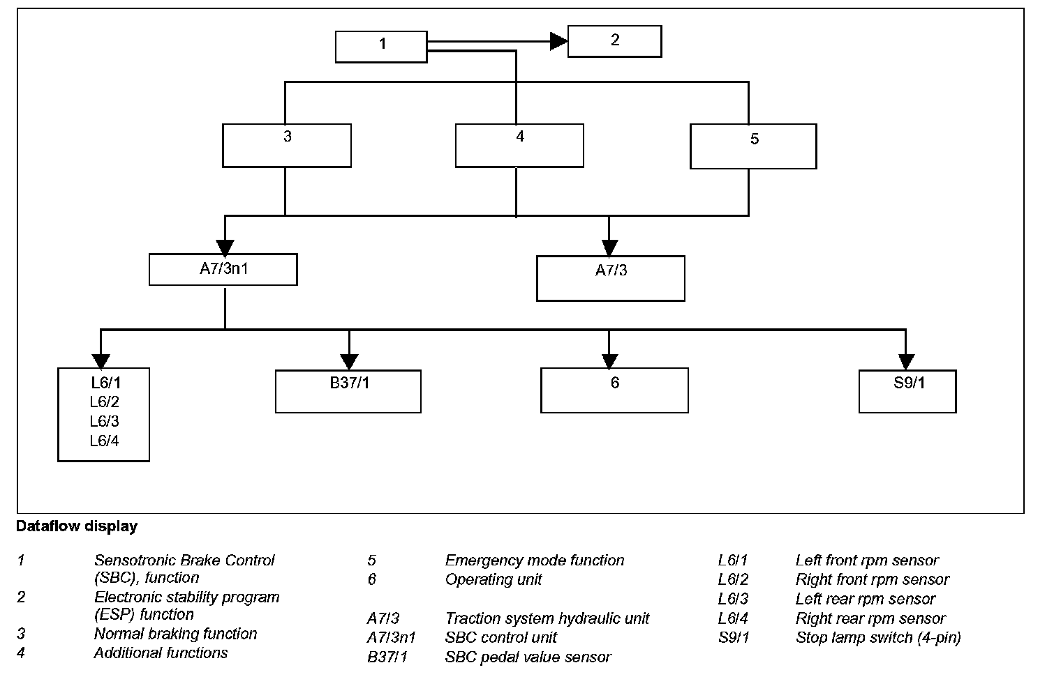 The driver's brake actuation is conveyed electronically to the SBC control unit (A7/3n1) via the SBC pedal value sensor (B37/1). The brake pressures computed by the ESP control unit (N47-5) are allocated individually to the individual wheel brakes via the traction system hydraulic unit (A7/3).