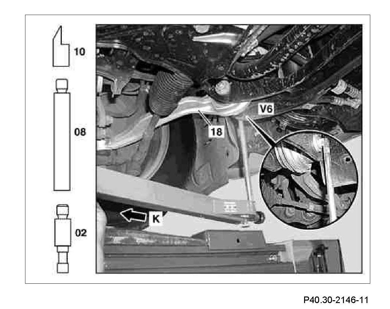 4 Measure comparative measurement (V6) from the check point (K) to the centering point of the mounting bolt of the torque strut on the front axle carrier, left to right. Measure on the left and right side in each case.