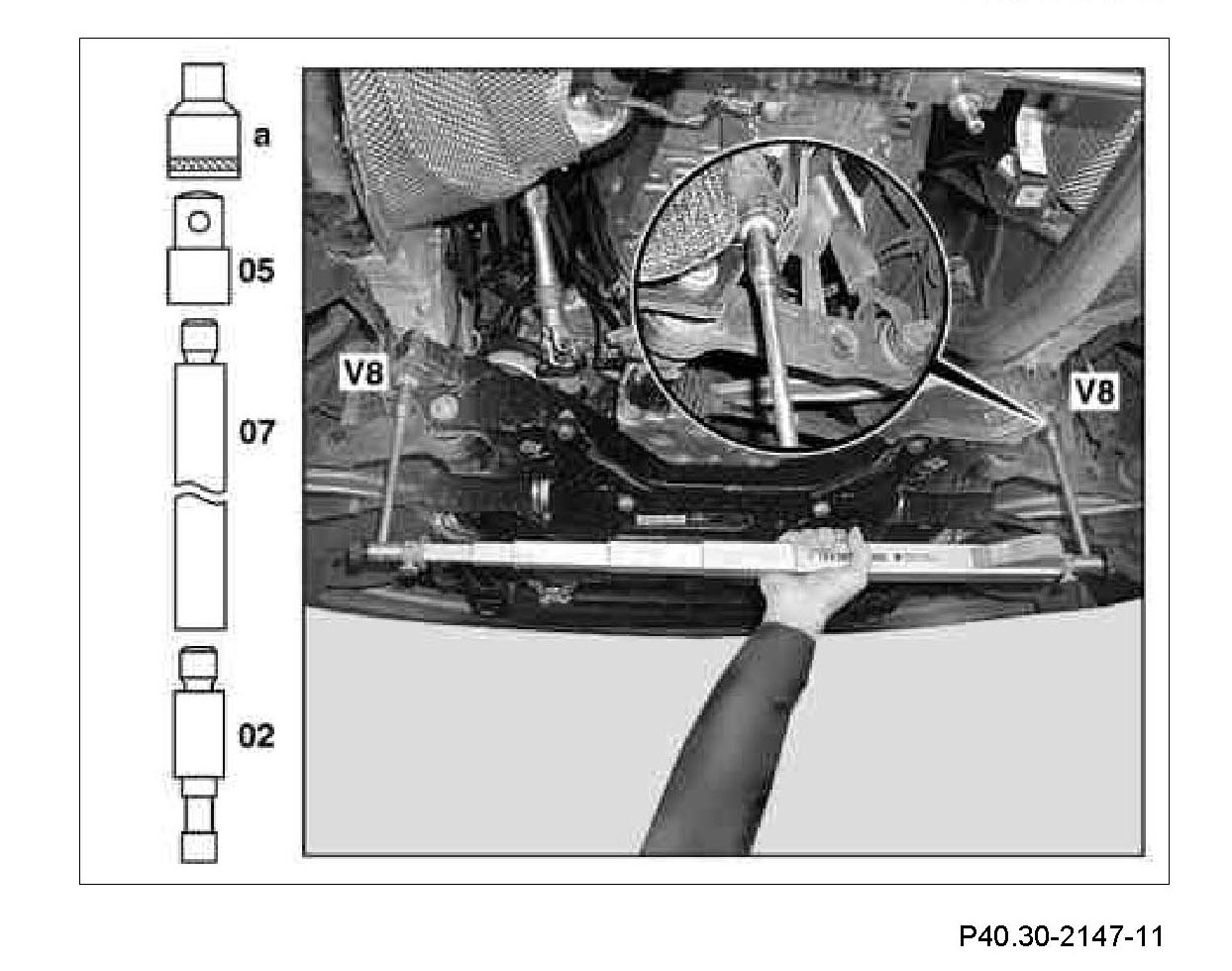 5 Measure distance dimension (V8) from the centering point of the Torx bolt heads between the rear bearings of the front axle carrier.