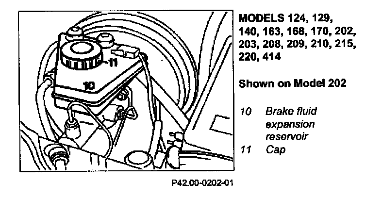 - The fluid level must be between the "MAX." and "MIN." marks embossed in the brake fluid expansion reservoir (10).