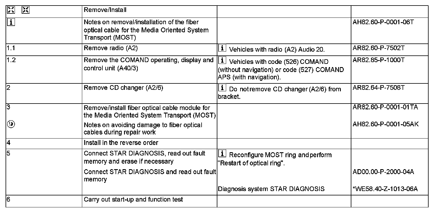 AR82.60-P-0001TA Remove/Install Fiber Optical Cable For the Media Oriented System Transport (MOST)