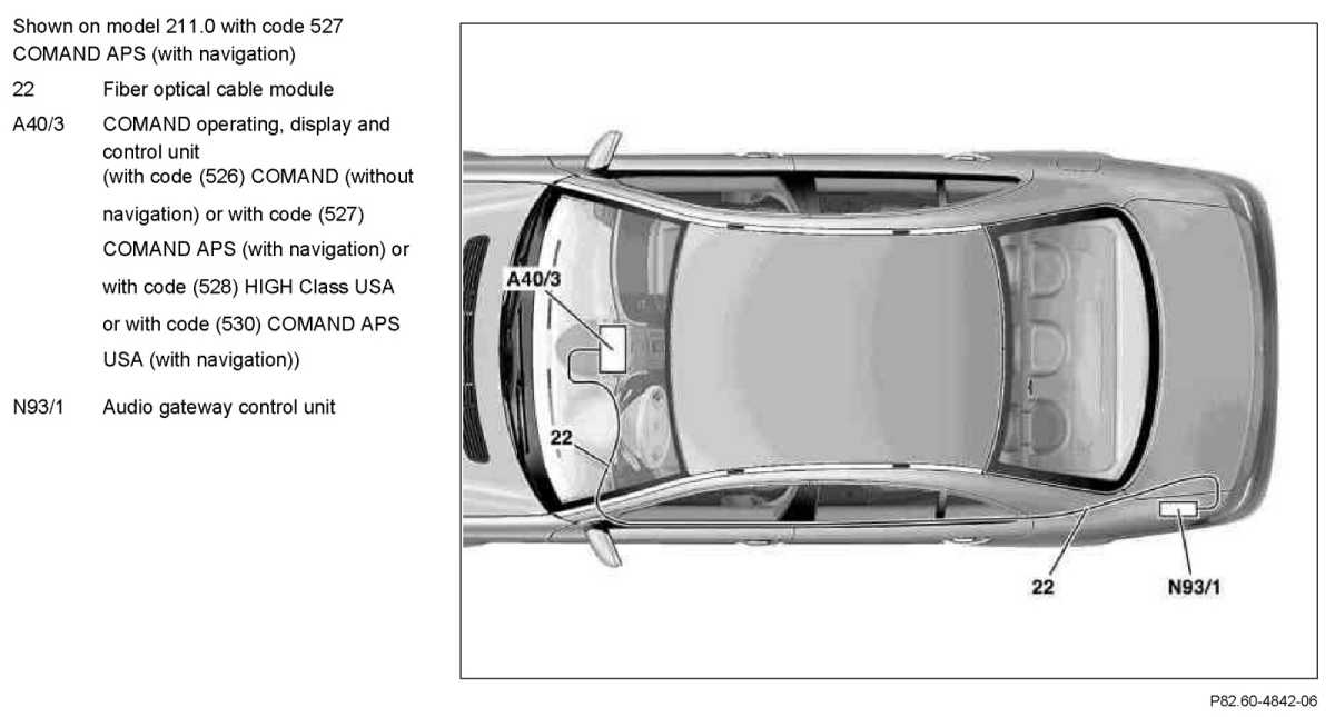 - Fiber optic cable (MOST) between audio gateway control unit and radio/COMAND