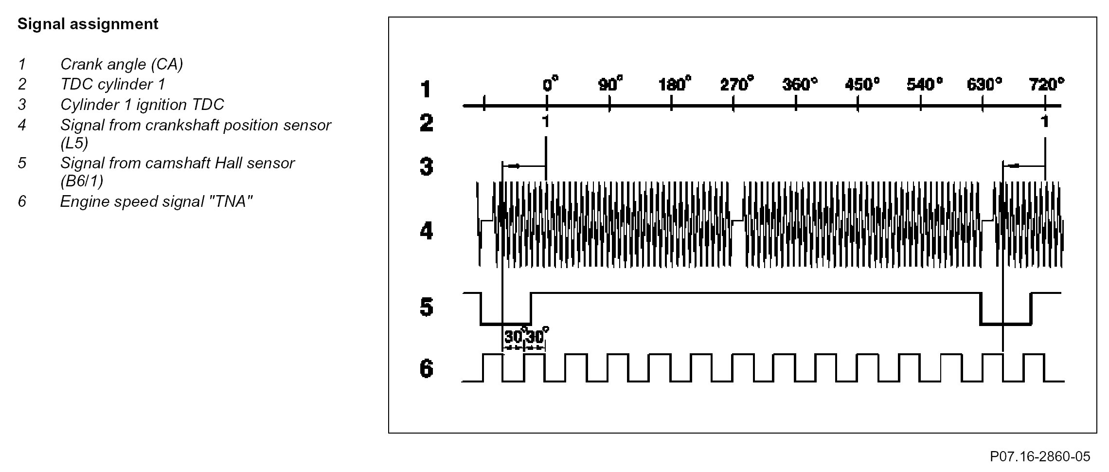 The CDI control unit detects the ignition TDC position of cylinder 1 if, at the point of the second negative signal edge after the gap, the signal "low" (signal voltage 0) is present at the camshaft Hall sensor.