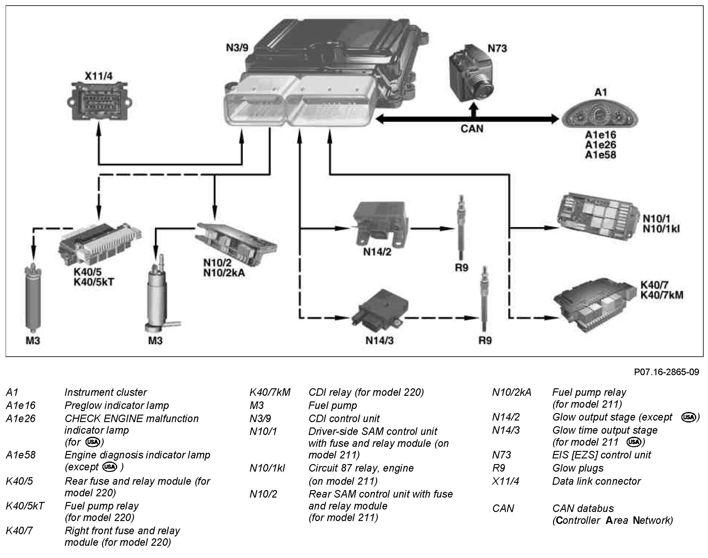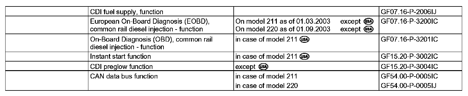 ^ To obtain a lamp check in the preglow indicator lamp and the engine diagnosis indicator lamp (or for model 211 (United States of America) the CHECK ENGINE indicator lamp) are actuated the instrument cluster for about 1 second