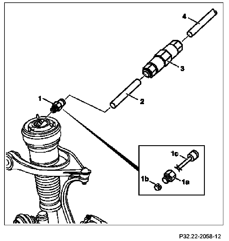1 Undo compressed-air terminal (1a) from affected component (e.g. suspension strut) and cut pressure line (4) to suitable length using the knife.