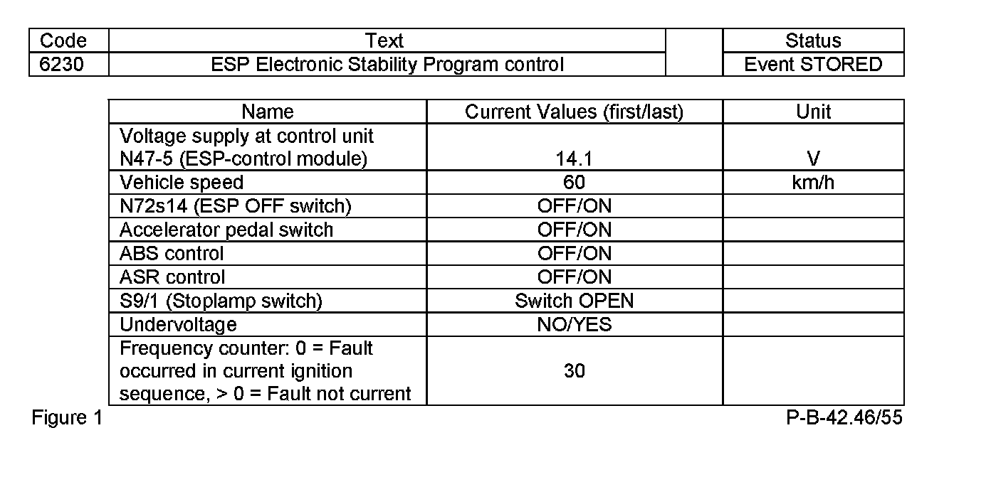An Event Code is stored in either the SBC or ESP control module, if an ABS or ESP control/action has taken place (i.e. event). The SBC or ESP control modules then merely records these activities and labels them as Event Codes. The entry of an Event Code takes place without the customer/driver noticing, thus no audible or visual displays are provided. An example of an Event Code with corresponding Freeze Frame data can be seen below in Figure 1.