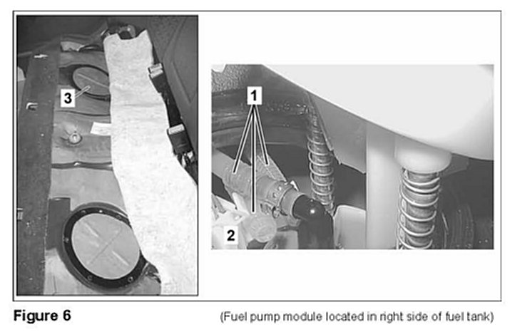 ^ In order to gain access to fuel filter module assembly hoses (1 Figure 6) and electrical connector (2), it is necessary to gain access to fuel pump module assembly in the right side of fuel tank (located under right fuel tank access cover [3]).