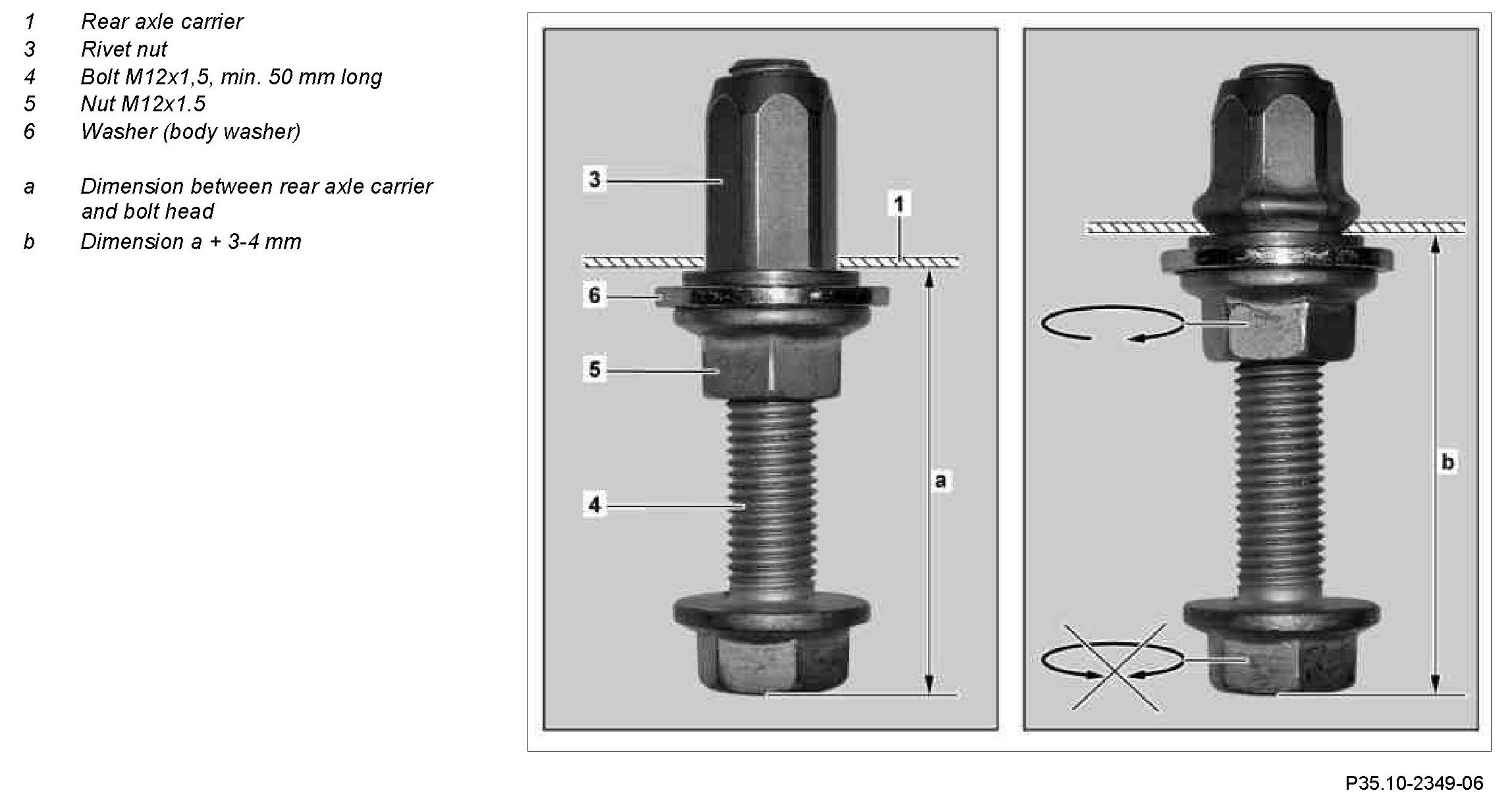 Do not turn at the bolt. Otherwise the hexagon on the rivet nut or the hexagon bore in the rear axle carrier can be damaged.