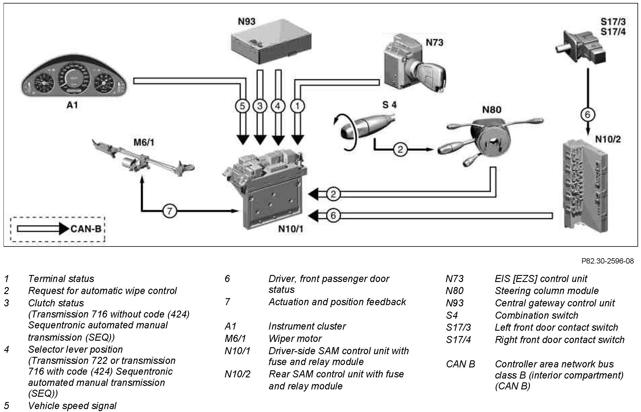 The wipe cycle is suppressed, if the driver or front passenger door is opened at a speed of less than 3 km/h. The status of the door contact switches is read in by the rear SAM control unit and transmitted via CAN-B to the driver-side SAM control unit.