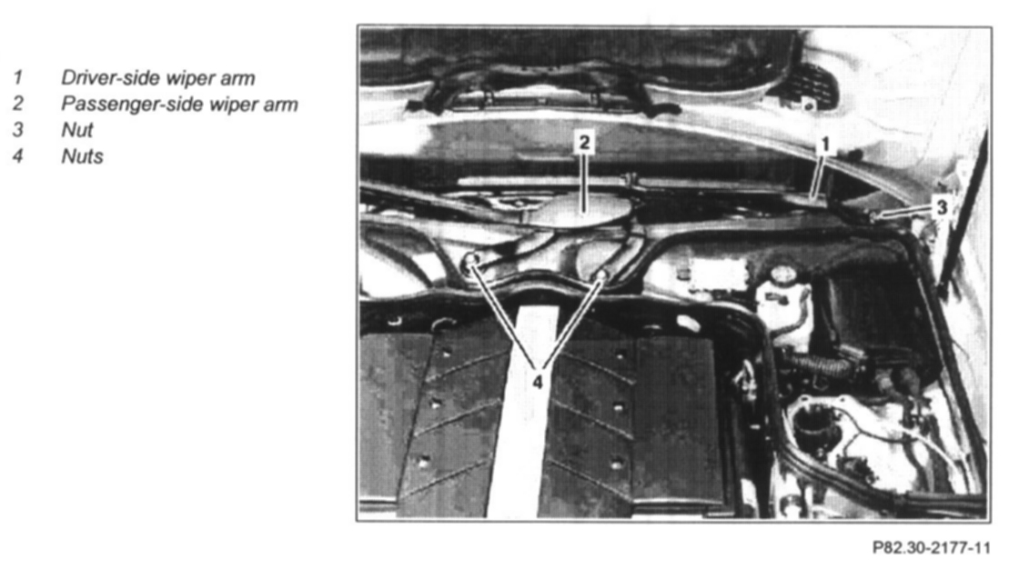 6 Unscrew nuts (4) on passenger-side wiper arm (2)