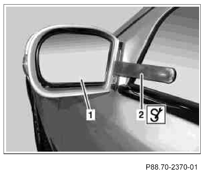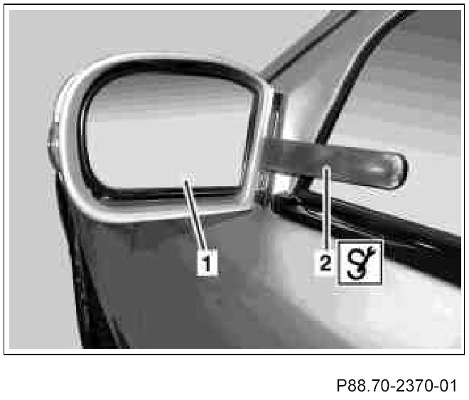 1. Fold outside mirror (1) toward front by hand and secure with mounting wedge (2) against folding back.
