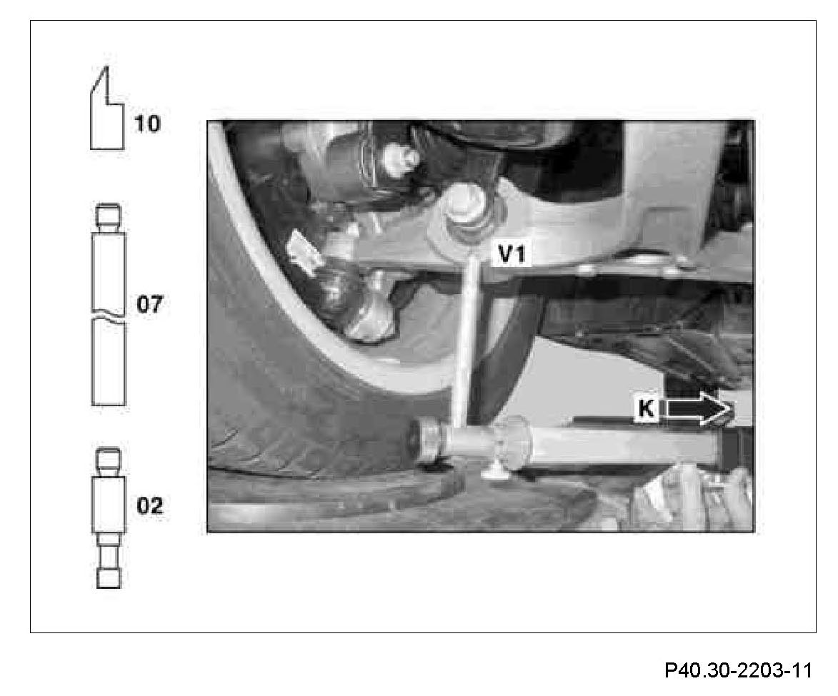 1 Measure comparative measurement (V1) from the check point (K) to the bolted connection of the suspension strut on the lower transverse control arm. Measure on the left and right side in each case.