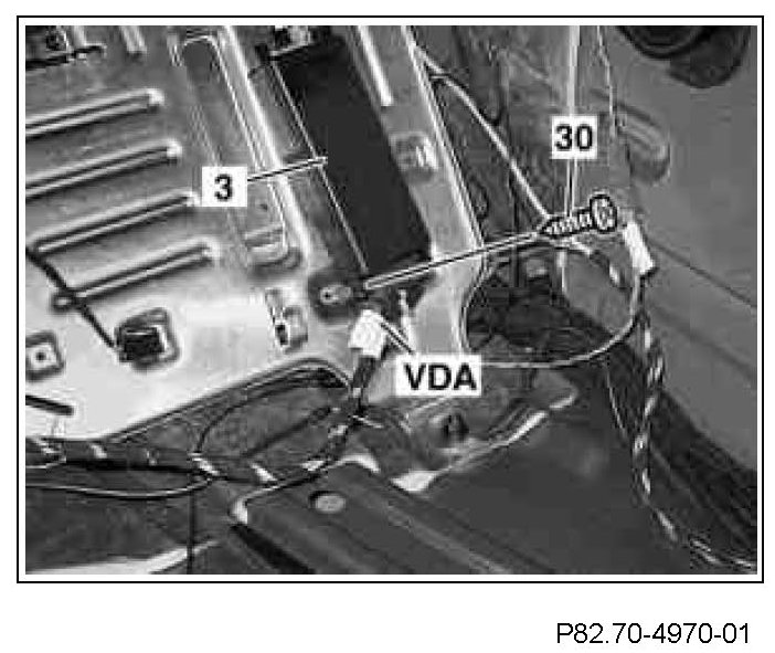 5 Uncover connection lines (VDA) in area of the right A-pillar and connect to the handsfree system interface box (3).