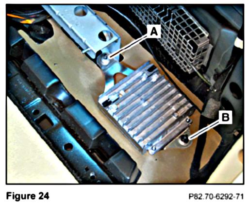 3. Use the previously removed M5 nut (Figure 23) to fasten the long arm of the linear compensator bracket to the threaded stud (A, Figure 24) securing the rear of the support beam on the exposed right side floor of the load compartment.