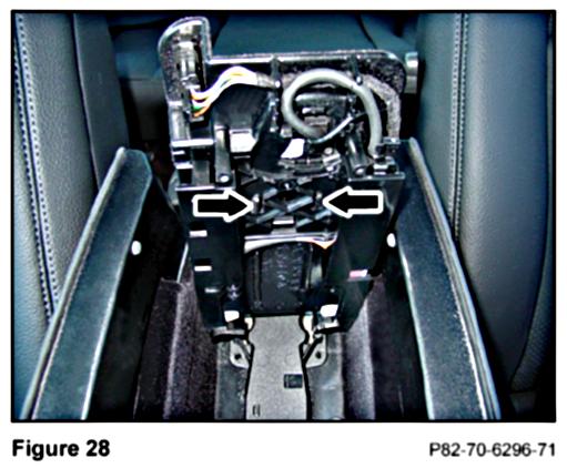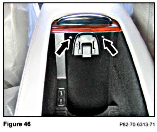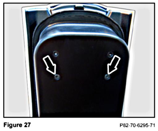 2. Open the lower compartment of the center console and remove the two T8 Torx screws (Figure 27) on the underside of the upper compartment.