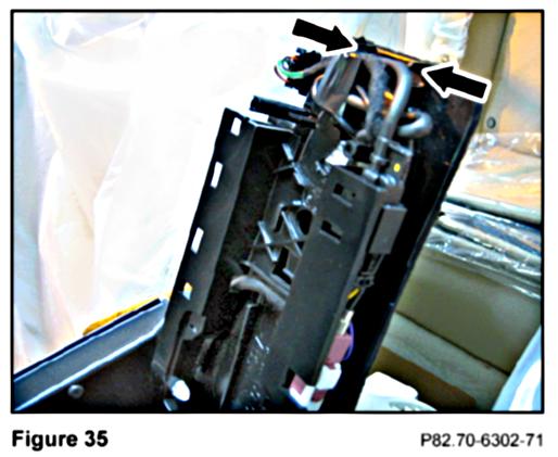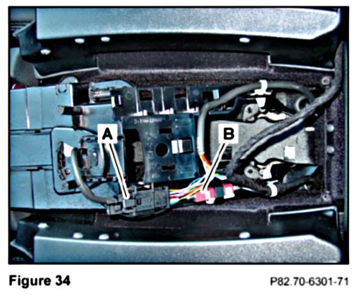 9. Connect the FAKRA antenna male connector from the contact plate to the FAKRA female connector from the console harness (B, Figure 34).